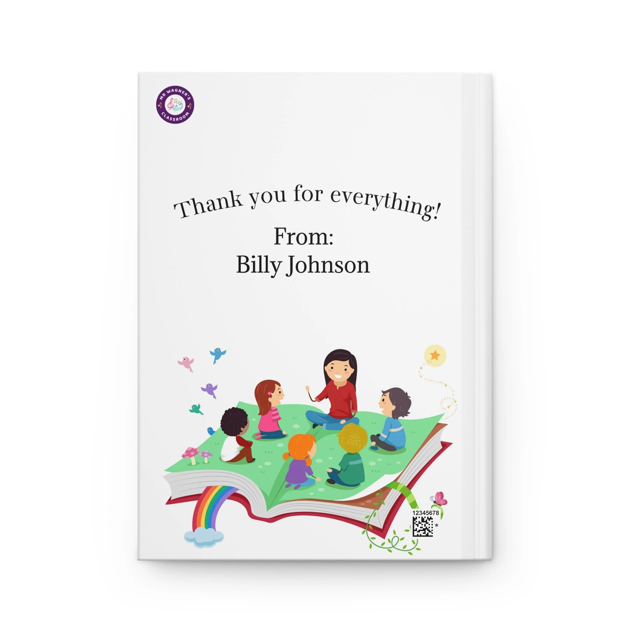A heartfelt hardcover journal designed to celebrate teachers and capture classroom memories. The smooth matte cover carries a bright, cheerful design—playful lettering that reads “best teacher ever” paired with a colorful, storybook illustration on the back. Inside, 150 lined pages (75 sheets) with perforations let students or parents write messages, lessons learned, or thank-you notes and tear them out cleanly. The sewn casewrap binding keeps the book flexible and durable for daily use, while full wraparound printing keeps the cheerful artwork consistent from front to back. Small production barcode on the back is discreet and doesn’t distract from the design. This journal sits comfortably on a teacher’s desk, ready to hold classes of memories, thoughtful notes, and the little stories that make a school year special.
